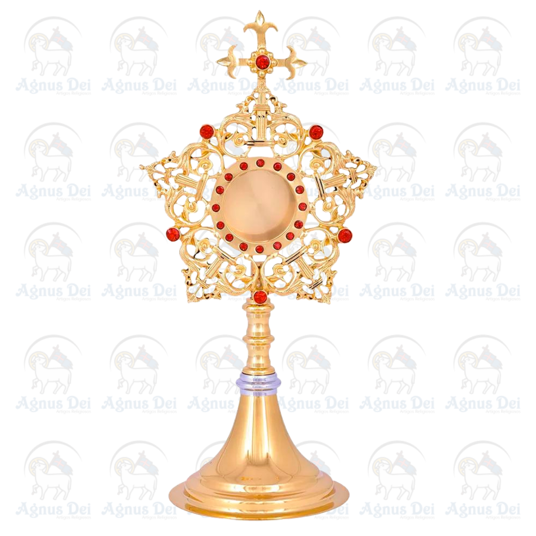 Relicário em Metal com banho dourado e pedras vermelhas sintéticas.