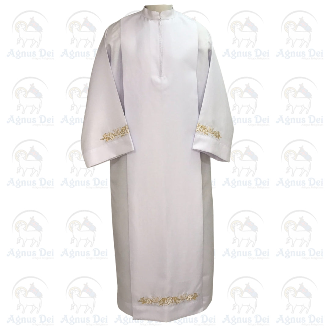 Túnica AD Bordado Trigo e Uva confeccionada em tecido Linhão ou Tunitex, com duas pregas na frente e atrás.