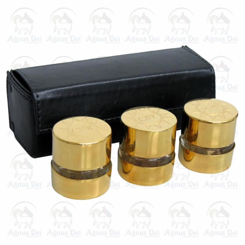 Vasos Santos Óleos, vidro com tampa e base de metal.