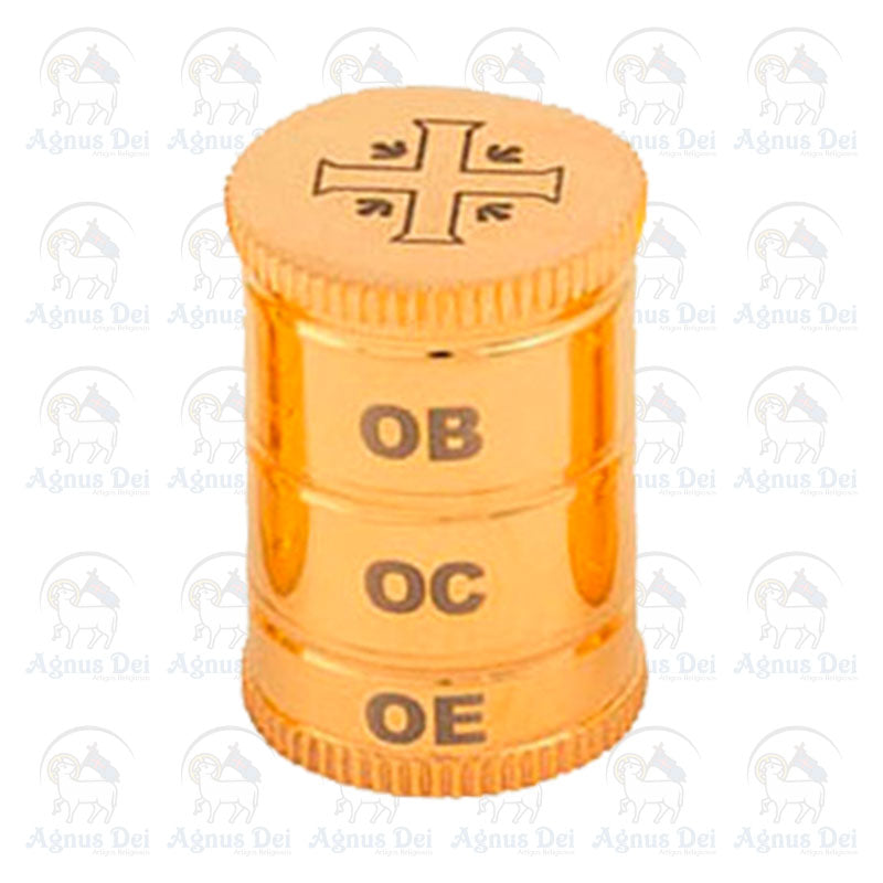 Vasos Santos Óleos em metal com banho dourado ou niquelado, contendo três repartições.